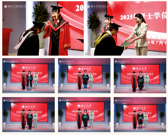 曹蓉和孙二丽为获得学士学位的学生代表拨穗正冠、颁授学位并合影。