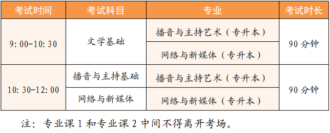 本次考试的专业为:播音与主持艺术(专升本)、网络与新媒体(专升本)。请各位考生仔细查看本人准考证(考生自行下载打印,详细操作参照下方第四项考前准备),按照本人准考证规定时间参加考试。